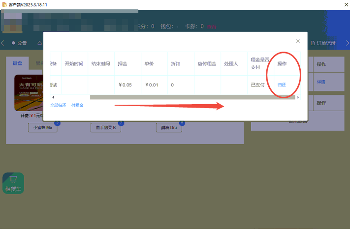 5、客户在使用完成后,点击详情,将下面滚动条向右拉,再点击“归还”