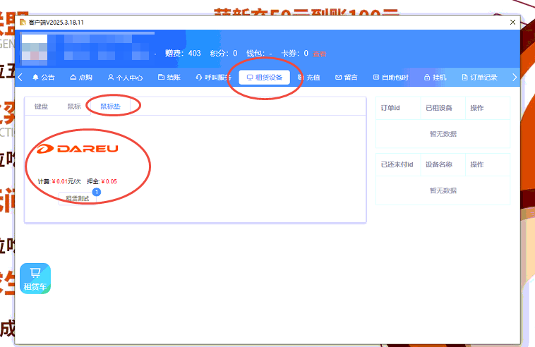 1、客户打开"租赁设备",在下方选择心仪的外设,图中标有费用和押金,如下图。