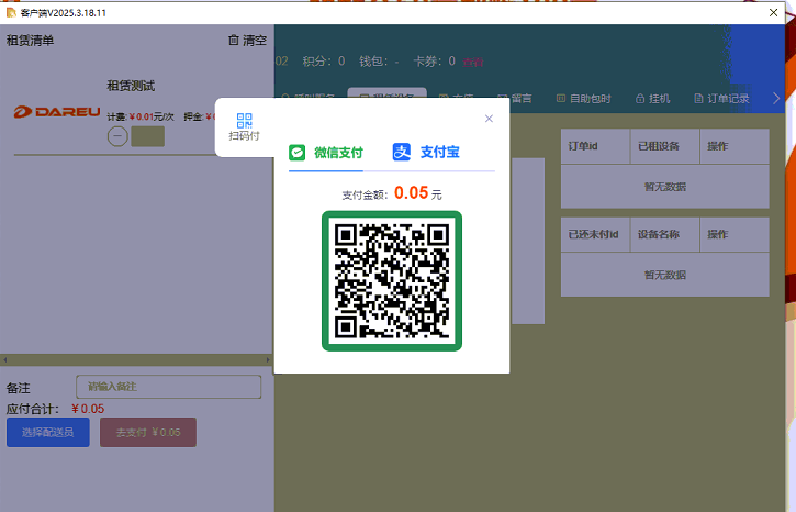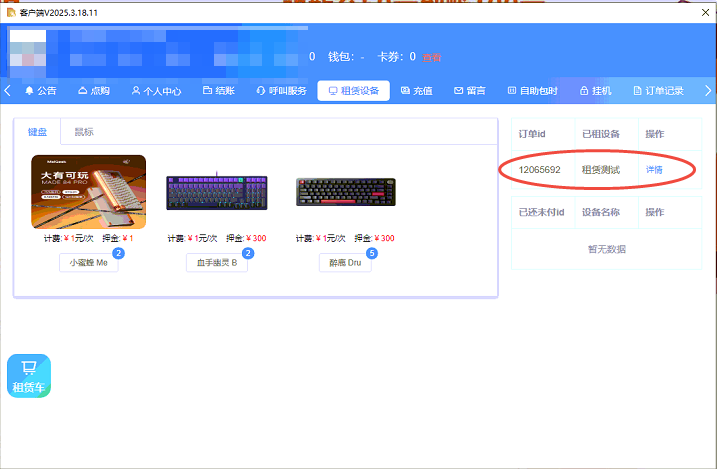 3、付款成功后,在客户端"租赁设备"页面右侧出现订单详情,包含订单ID等信息,如下图