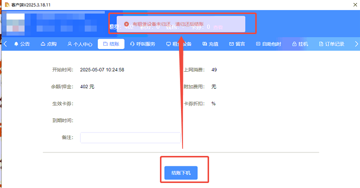 7、如果客户没有归还租赁设备,点击结账会出现下面提示,如下图
