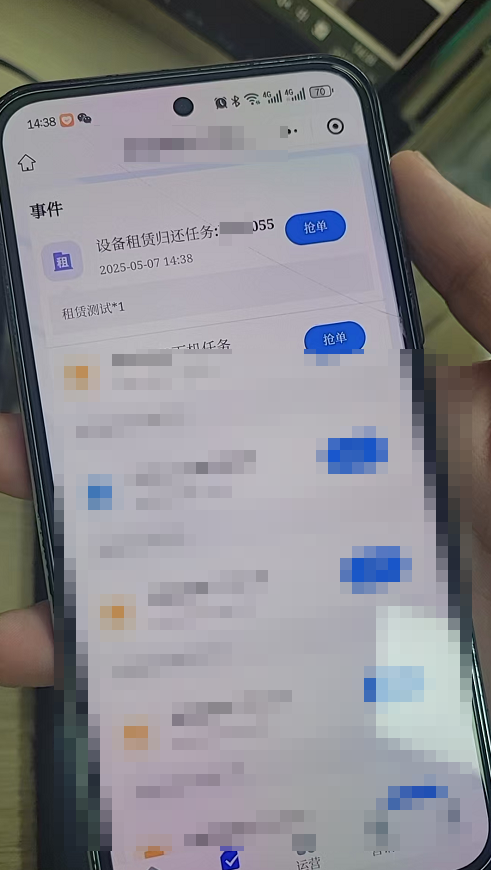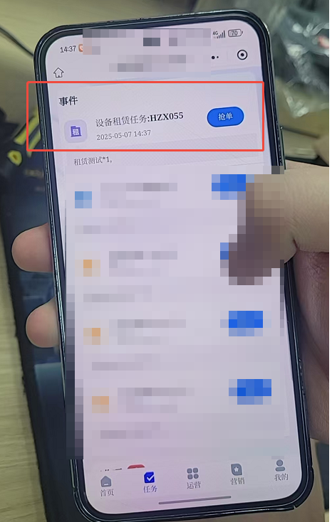 4、这时候任务屏上会出现提示,工作人员抢单、并拿取设备,送至客户那里协助插好设备,并告知客户专门的设备驱动启动方式方法,然后在小程序的任务里点击“完成”该任务。