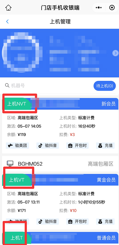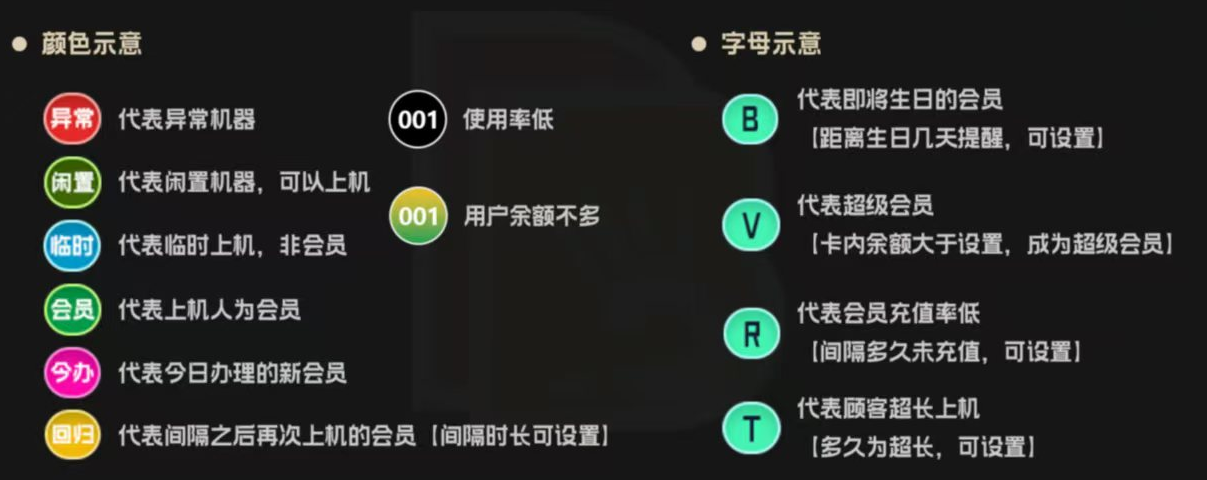 一般我们除了在手机端可以看到如问题里的图,有咨客图的门店还会看到如下面的图 有些门店负责人不了解图的意思,这里我简单来做下说明: N代表新会员 - New V代表Vip会员 - Vip T代表超长时间上机会员 - Time (这个超长上机时间界定是根据相关规定提前预设好的,一般为4小时) B代表即将生日会员 - Birthday (这个一般设置为7天) R代表会员充值率低 - Recharge (间隔多久未充值,这个一般设置的是30天) 然后咨客图里的颜色 可以参照下面的图