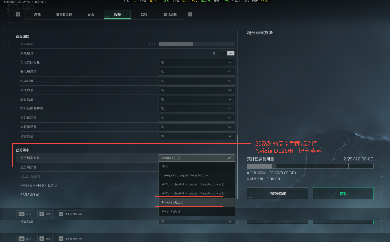 5、选择DLSS(切记下方的帧生成要关闭,不然会影响FPS的稳定性)