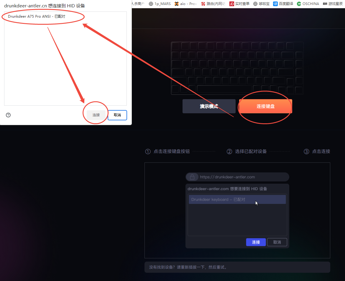 3、点击“连接键盘”按下图操作,如果找不到键盘请重新插拔一下数据线(确保数据线无破损和接头损坏)