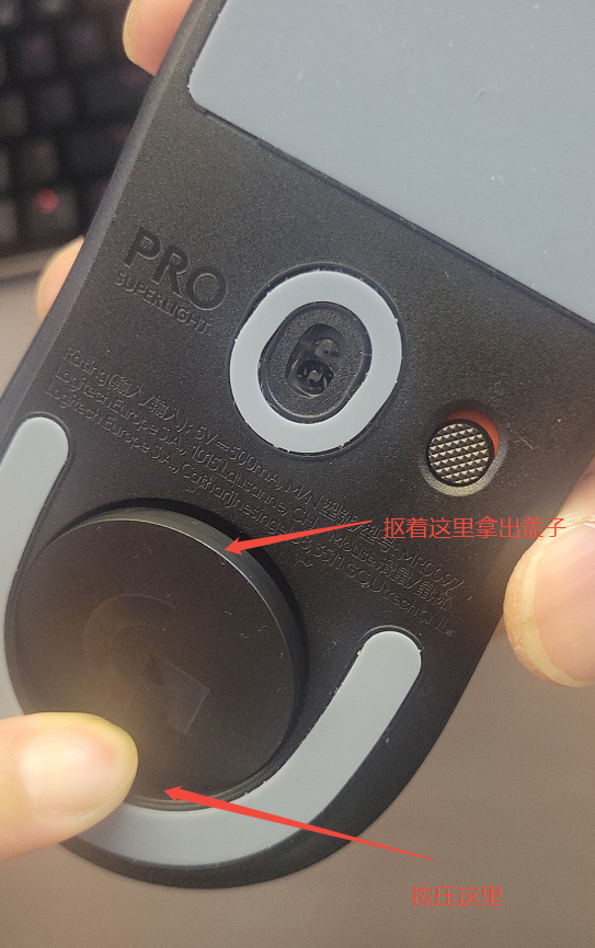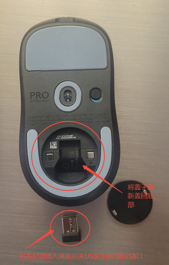 ③拔掉桌面开关或电脑上插着的USB发射器,放回鼠标底部圆形仓内。