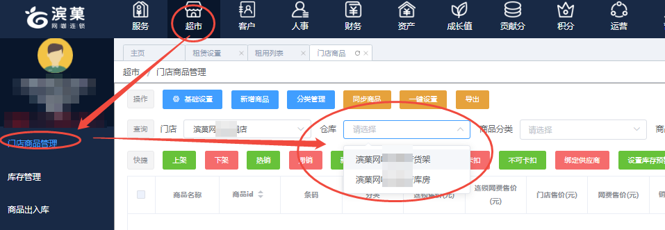 1、登陆网页后台,超市-门店商品管理-右侧的“仓库”选择相应门店的货架(吧台)或货架(吧台),然后点击查询按钮,如下图: