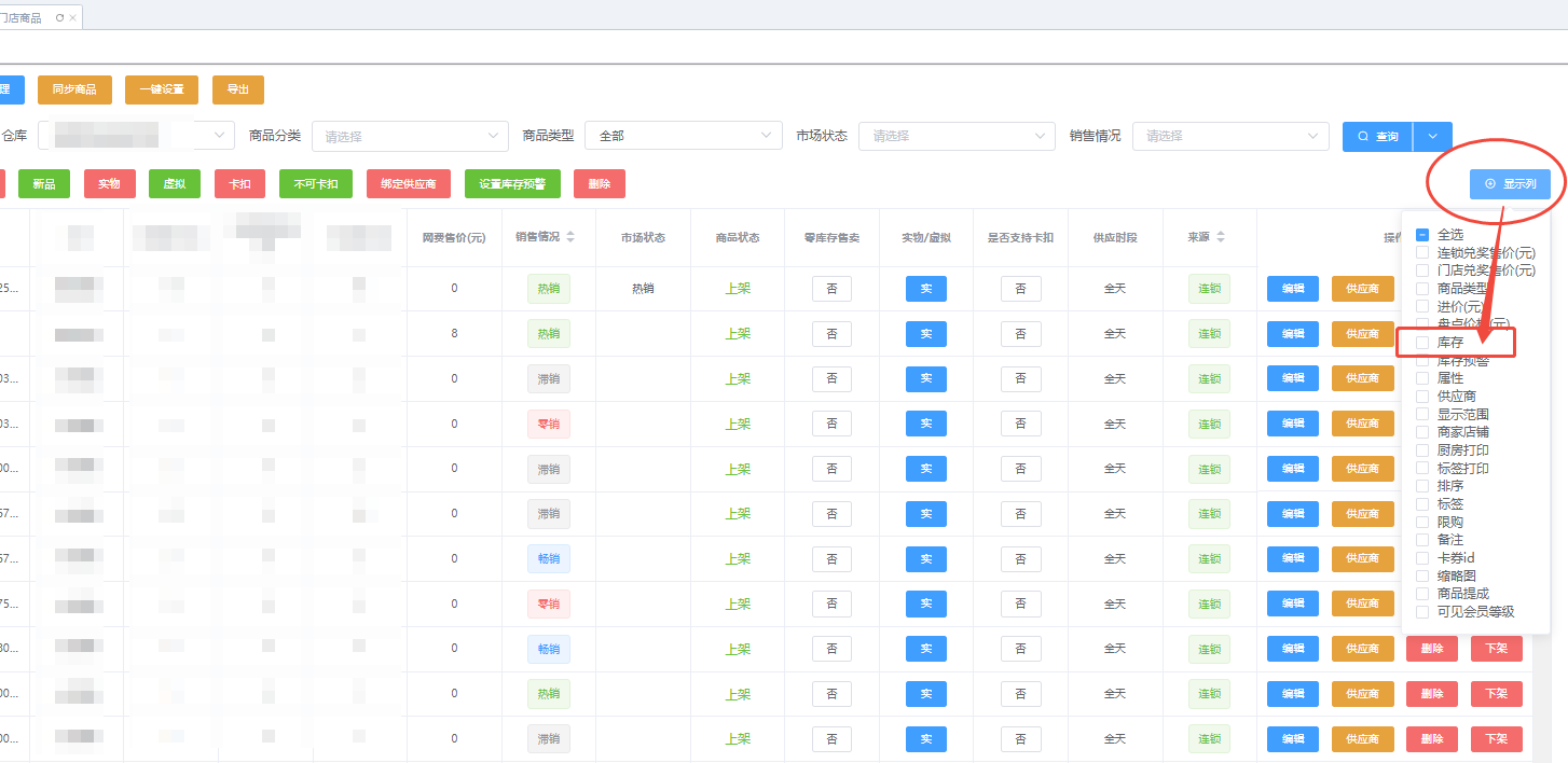 2、在搜索出的商品列表的右上方有个“显示列”按钮,勾选“库存”,即可显示库存数量