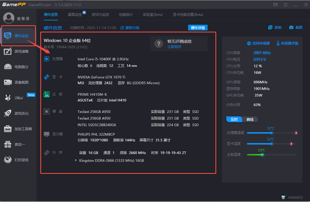 点击“硬件监控”在右侧可以看到这台机器的硬件信息,在最右侧可以看到处理器(CPU)、显卡、主板的温度