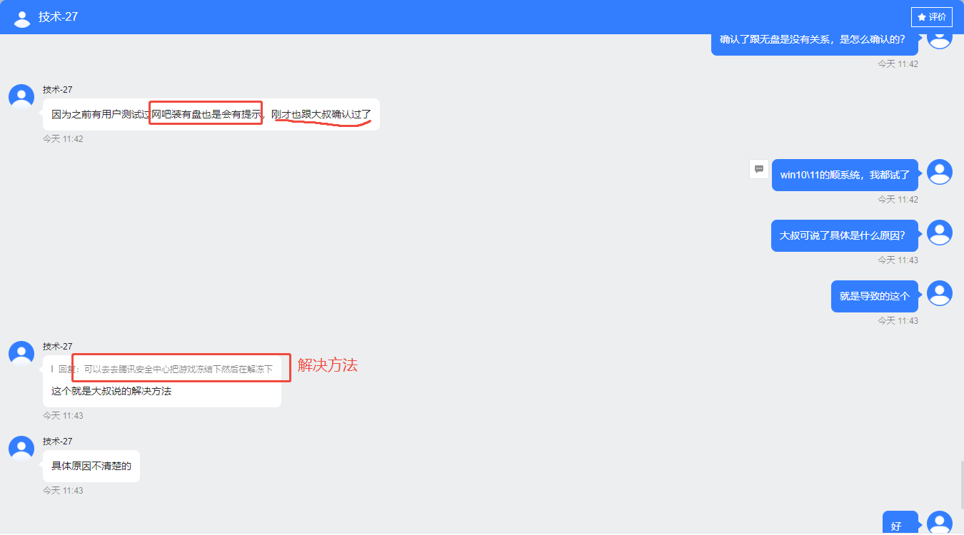 一、问题描述 1、一般来说,三角洲会提示:亲爱的干员,系统检测到您的账号出现数据异常,服务器与您的连接已断开,请检查异常或网络环境后体验游戏。(包含第三方未知的代理类、机器码类插件或者软件等恶意阻断数据)一般会封号1分钟 2、无畏契约则是在安全中心内提示:处罚原因:安全数据上报异常,请不要使用修改机器码工具;违法的行为规范:修改游戏客户端。 二、问题排查 1、我们重启过服务器、路由器; 2、也不加任何第三方软件(包括收费系统、网监软件等)启动过,外地也有说有盘系统也出现过; 3、系统用了全新的镜像包,使用了最新的安全软件查杀过; 4、网络也调整过、游戏协议也全部从专线网络走; 5、游戏也删除重新下载了,但是问题依旧出现。 6、联系过网维公司和外地的著名维护商,都说最近出现的较为频繁,并表示这个跟账号关联性比较大,尤其是之前在外地登录过然后回来本地的客户。 三、问题定性 一般来说这个封禁时间不是很长,重启机器后过了封禁时间即可正常游戏。初步判断是跟腾讯的反作弊(ACE)有关,也可能跟个人账号或者机器被腾讯官方标记了有很大关系(很大一部分是客户在外地的IP地址有过登录wegame或者游戏,然后换了地方再登录就会出现),所以我们需要引导客户正常看待这个问题,并积极解释这个确实不是由于我们门店内部原因造成的。 四、解决方法 1、不要把自己账号借给别人用; 2、在外地登录过的,来本地用一般提示的可能性非常大; 3、不要找代练跑刀,不要以为帮你跑刀的都是手搓; 4、遇到这个问题请使用以下方法解决:https://mp.weixin.qq.com/s/uGcH_Cxpbq0dlAbJwnCXaQ?mpshare=1&scene=1&srcid=0305tDUPFfdfJSWPrmaBKj4u&sharer_shareinfo=cd8ad1be5bb5ebd1c930a88c3f43a3d9&sharer_shareinfo_first=cd8ad1be5bb5ebd1c930a88c3f43a3d9&color_scheme=light#rd